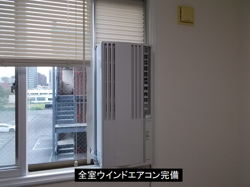 インターホン、ユニット(バス・洗面台・トイレ)、給湯器、ベッド、机・椅子、ウインドエアコン、暖房ストーブ、クローゼット、冷蔵庫、パイプハンガー、照明器具、ブラインド、インターネット(Wi-Fi対応)無料、BS/CS対応